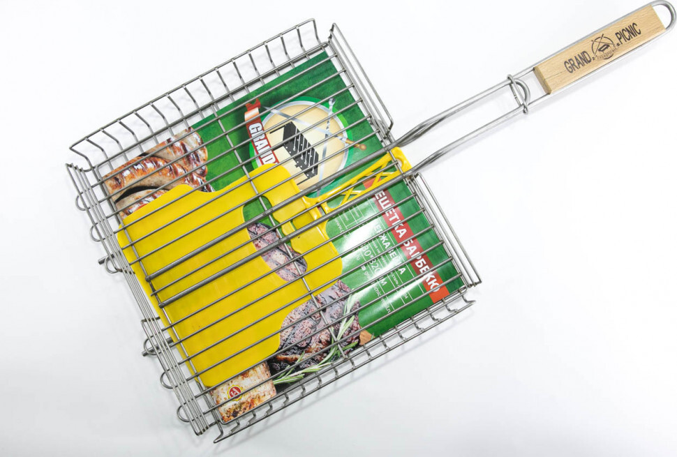 Профессиональная решётка из нержавеющей стали для приготовления блюд на мангале. Имеет зажим и деревянную ручку.